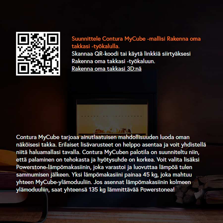 Contura MyCuben T palotila on suunniteltu tarjoamaan korkea hyötysuhde ja tehokas palaminen. Voit valita lisävarusteeksi myös lämpöä varastoivan Powerstone-lämpömakasiinin. Yksi sarja painaa 45 kg ja niitä on mahdollista laittaa takkaan useampia. lämpömakasiinin ansiosta takka varastoi lämpöä pidempään.
